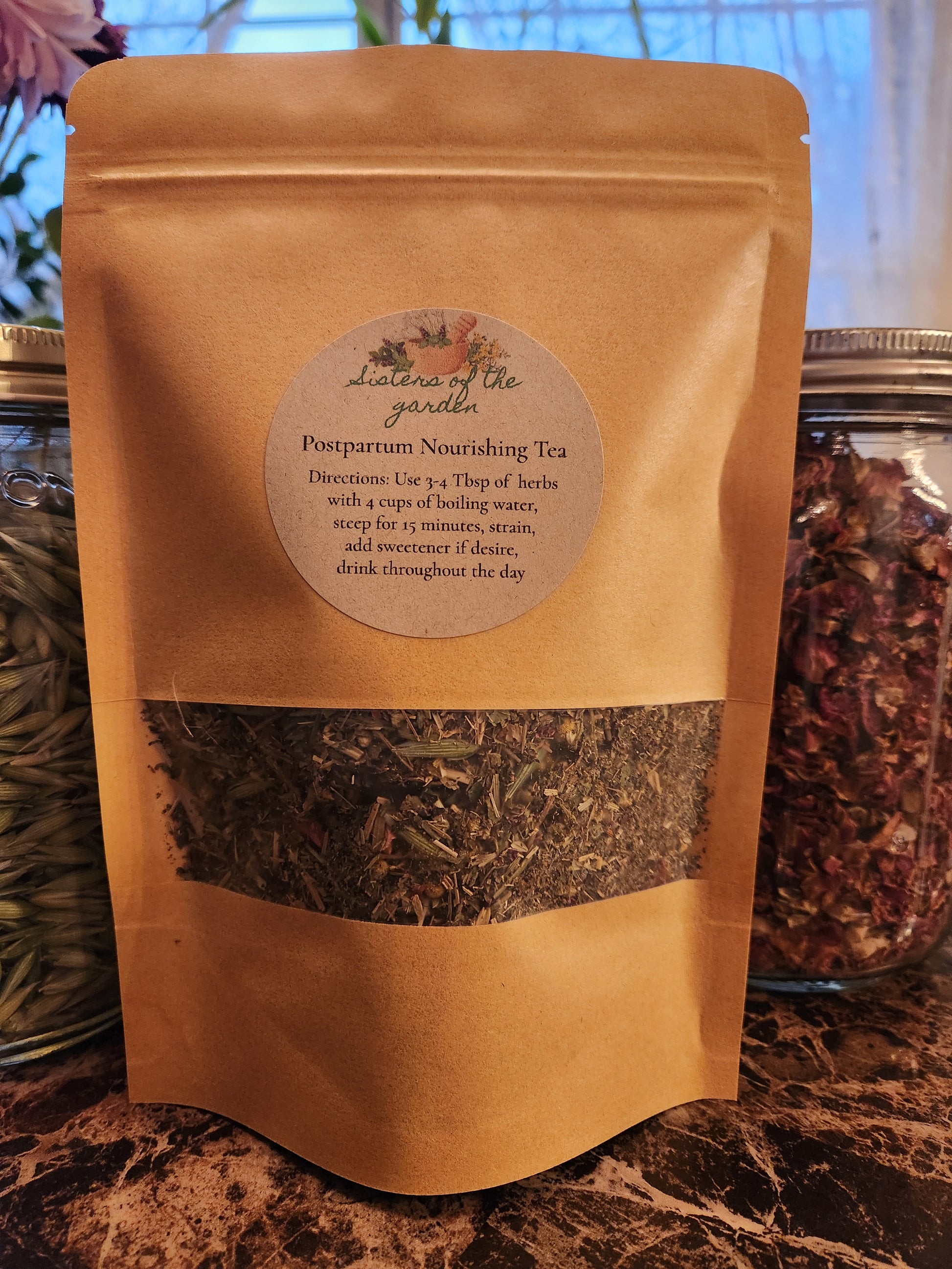 Our Postpartum Nourishing tea, is handcrafted with the perfect blend of herbs to feed the nervous system and adrenals, helping you cope with the fatigue & stress of caring for a tiny person around the clock. This blend also encourages connective tissue healing for both vaginal & cesarean births.
